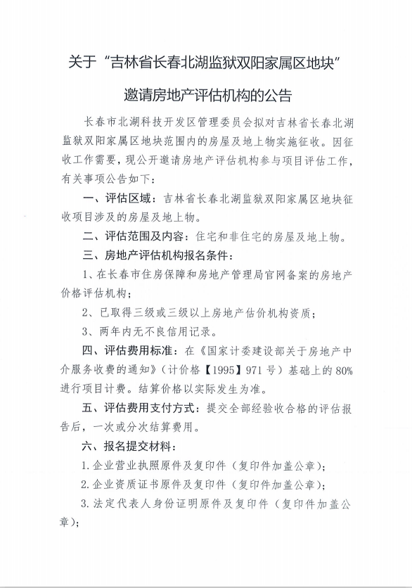标 题: | 关于吉林省长春北湖监狱双阳家属区地块邀请房地产评估机构的公告 |