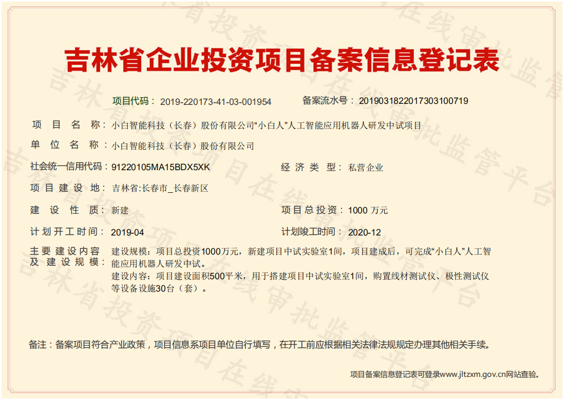 | 标 题: | 小白智能科技(长春)股份有限公司“小白人”人工智能应用机器人研发中试项目 |