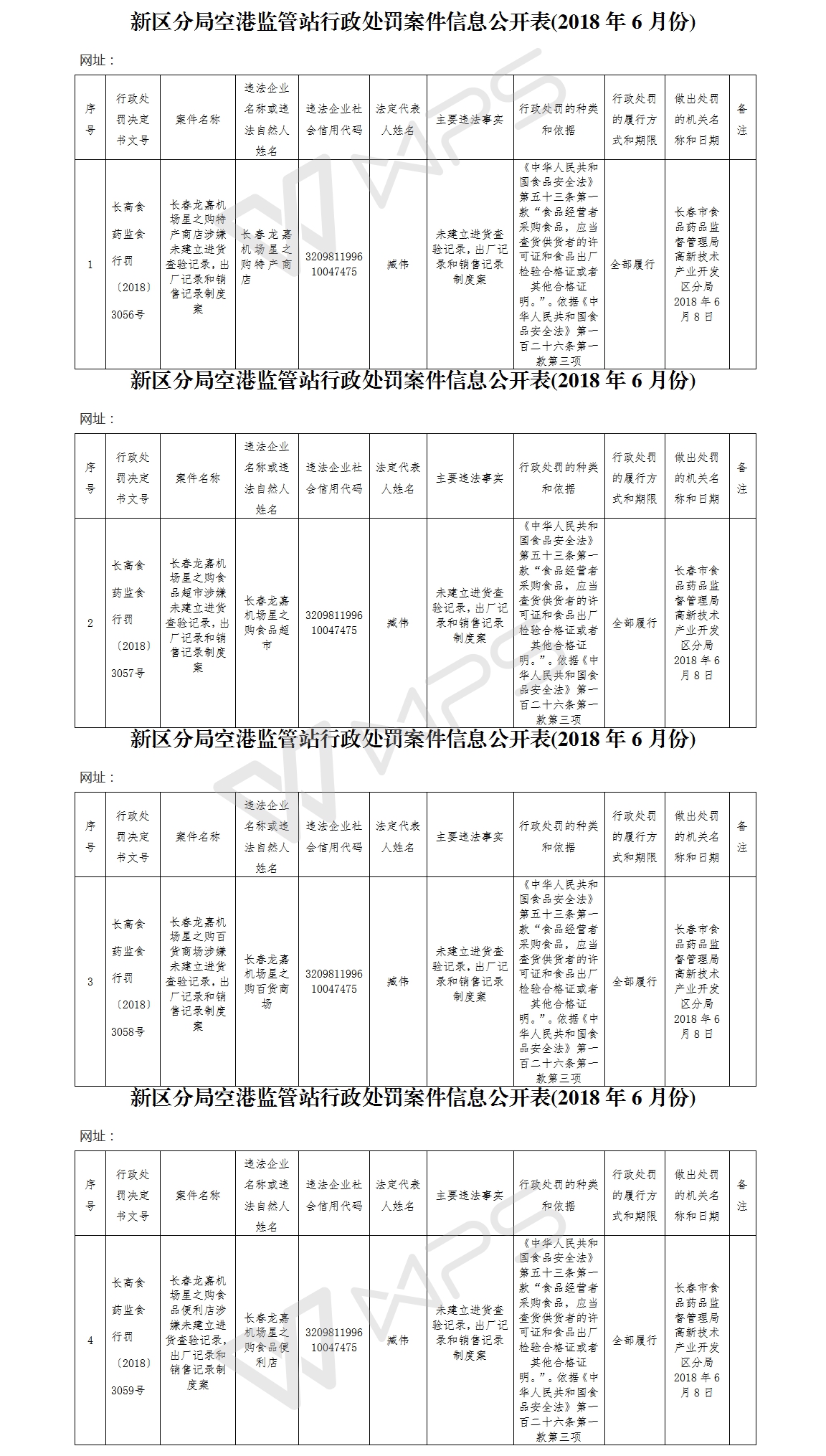 | 标 题: | 食药监新区分局空港监管站行政处罚案件信息公开表(2018年6月份) | ||