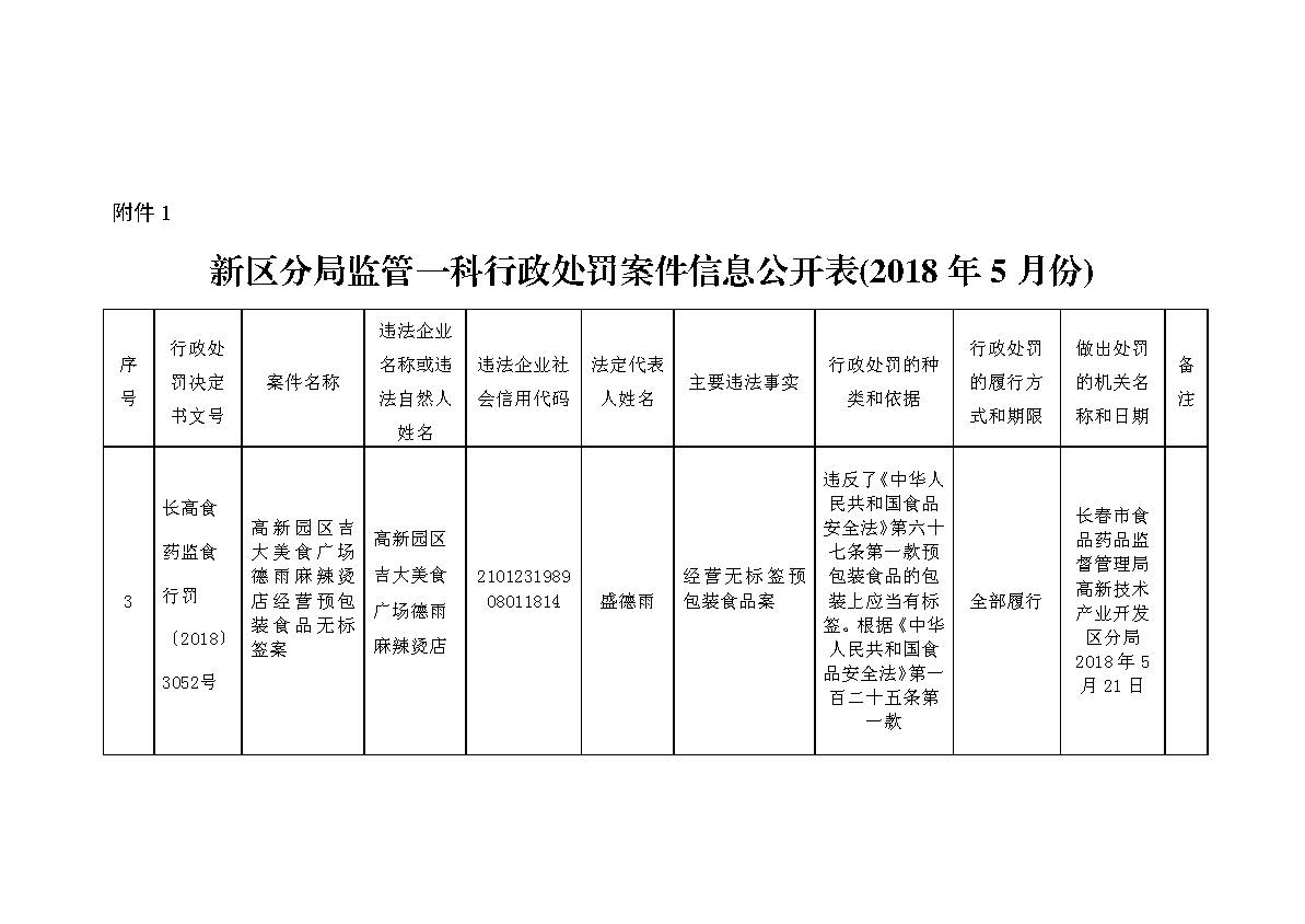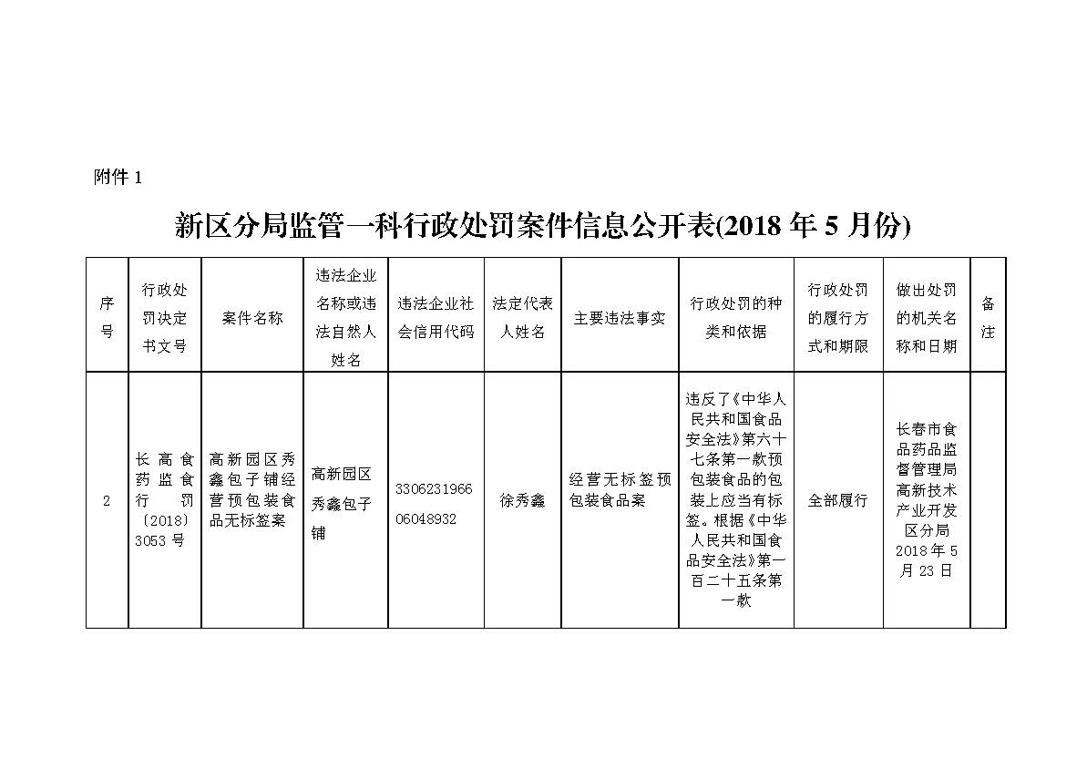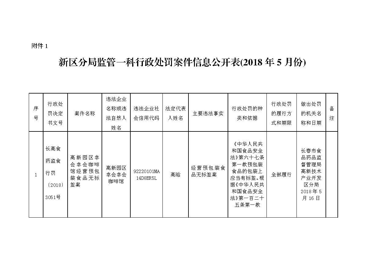 | 标 题: | 食药监新区分局监管一科行政处罚案件信息公开表(2018年5月份) |