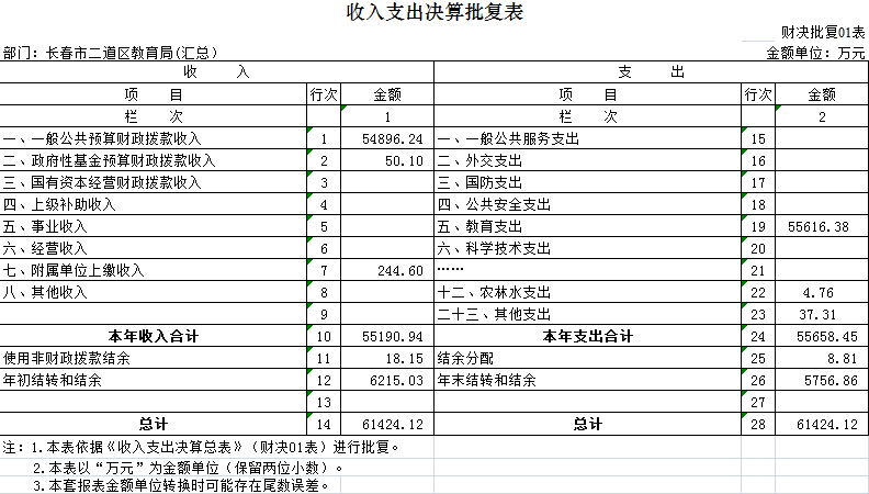 2020年度收、支总计各61424.12 万元。与2019年相比,收、支总计各增加8,386.74万元,增长15.82 %。主要原因:2020年全区教师绩效奖金发放金额较大,投入东新小学建设资金、教育装备购置资金规模较大。