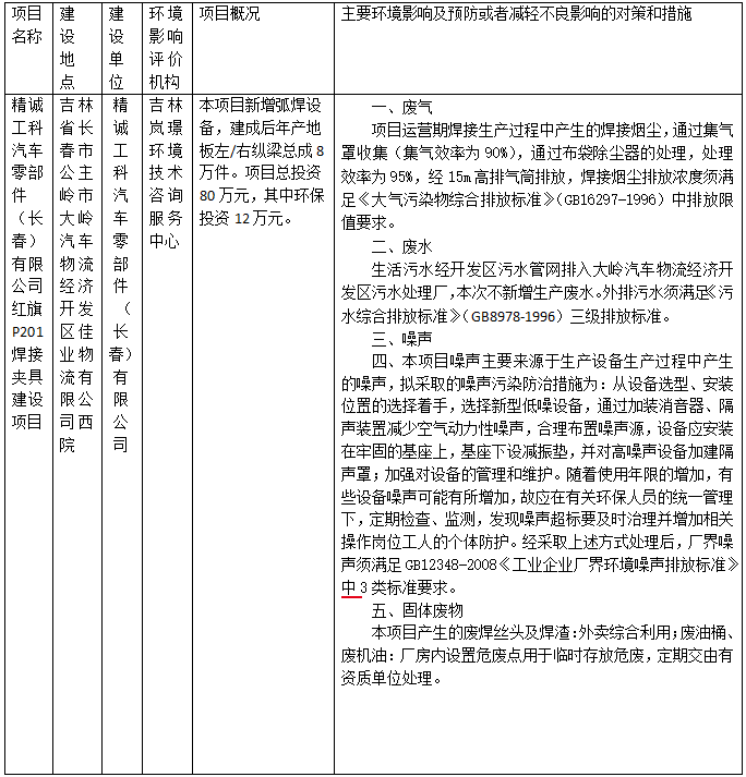 根据建设项目环境影响评价审批程序的有关规定,我局拟对精诚工科汽车零部件(长春)有限公司红旗P201焊接夹具建设项目环境影响报告表进行审查。为保证审查工作的严肃性和公正性,现将拟审查的环境影响评价文件基本情况予以公示,公示期为2天。