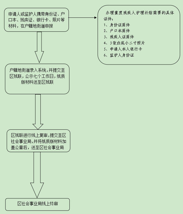 办理重度残疾人护理补贴,需残疾人本人或监护人持申请人身份证、户口本、残疾证、银行卡、照片等材料,在户籍地街道申报,补贴对象为残疾等级为二级及以上的残疾人,补贴标准为93元/人/月。