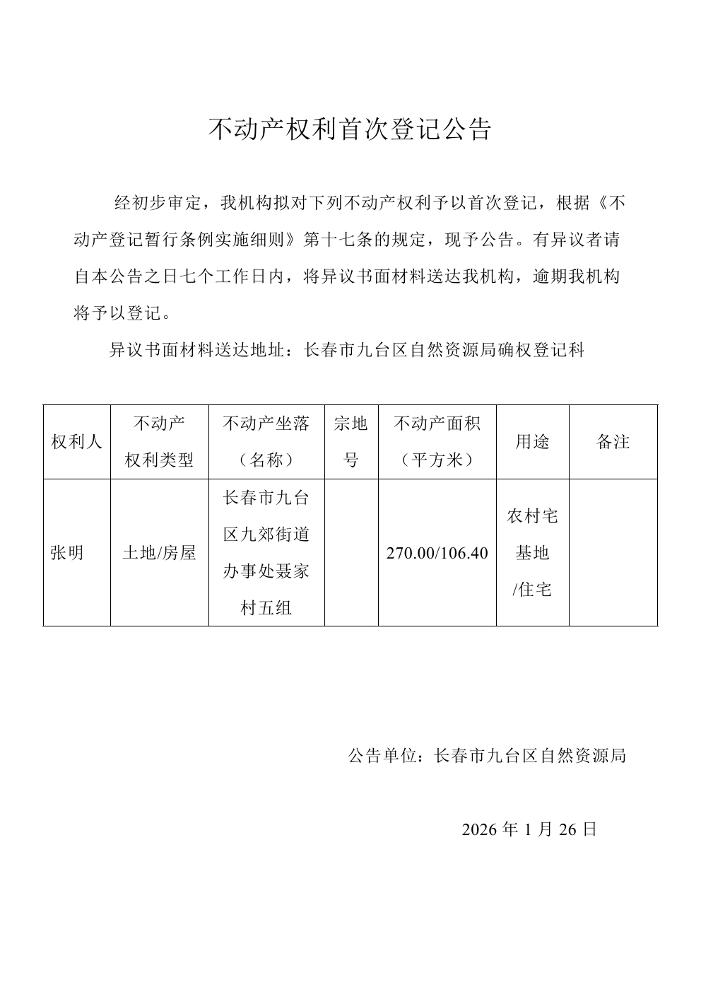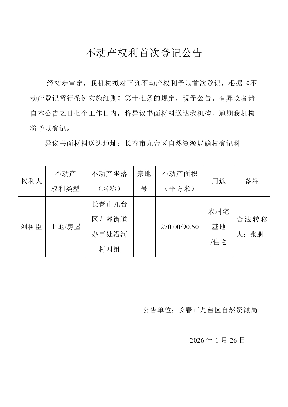 长春市九台区九郊街道办事处不动产权利首次公告(8则)