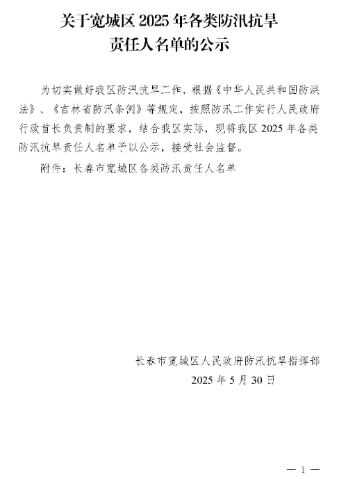 | 标 题: | 关于宽城区2025年各类防汛抗旱责任人名单的公示 |