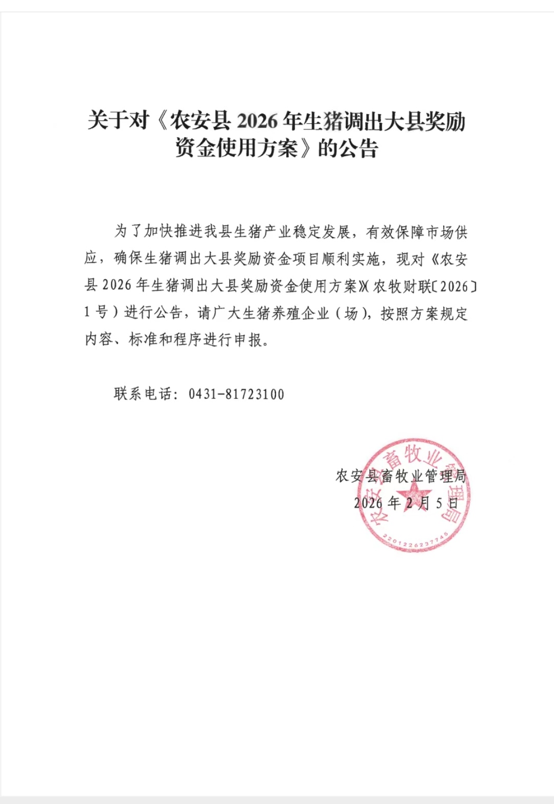 | 标 题: | 关于对《农安县2026年生猪调出大县奖励资金使用方案》的公告 |