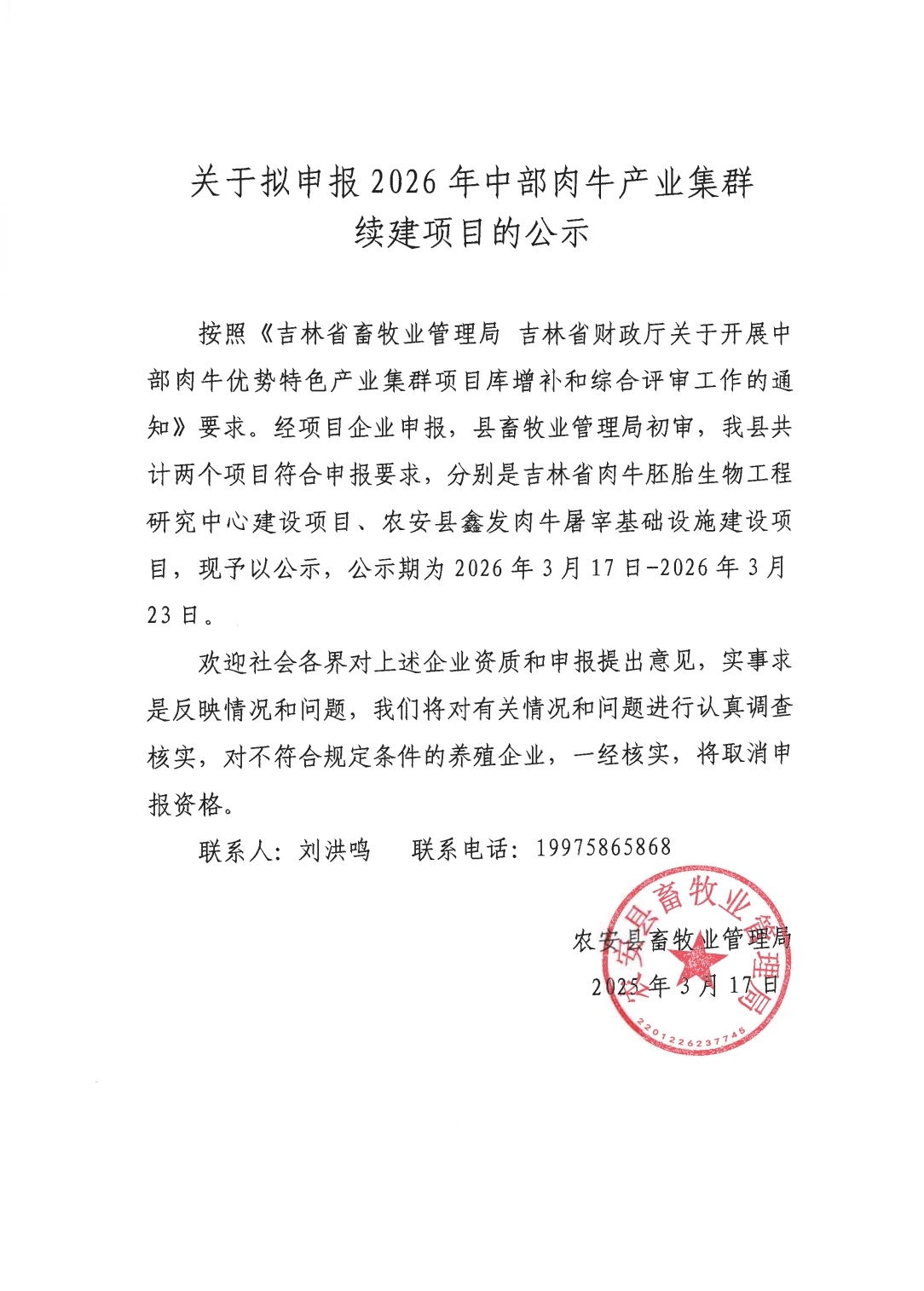 | 标 题: | 关于拟申报2026年中部肉牛产业集群续建项目的公示 |