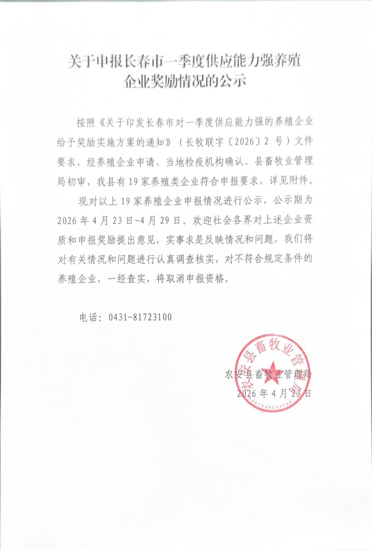 | 发文机关: | 农安县畜牧业管理局 | 成文日期: | 2026年04月24日 |