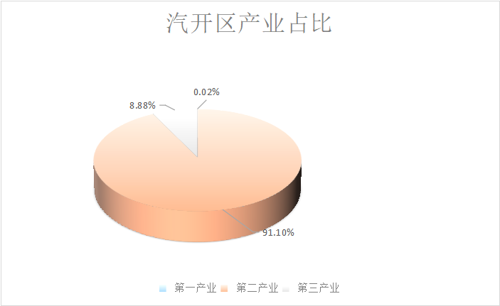 根据地区生产总值统一核算的初步结果,2023年汽开区地区生产总值(GDP)1035.6亿元,按可比价格计算,比上年增长8.4%。其中,第一产业增加值0.2亿元,下降4.9%;第二产业增加值943.4亿元,增长8.7%;第三产业增加值91.9亿元,增长5.4%。三次产业结构为0.02:91.10:8.88。按在籍人口计算,全区人均地区生产总值31.76万元。