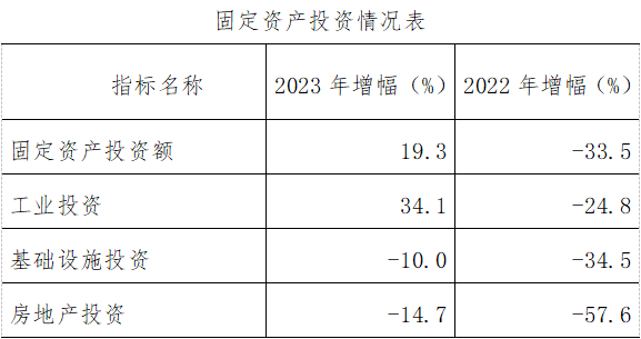2023年,固定资产投资比上年增长19.3%;其中,工业投资同比增长34.1%。