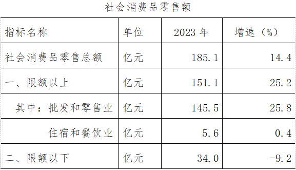 市场消费:2023年,实现社会消费品零售总额185.1亿元,同比增长14.4%。限额以上企业实现社零额151.1亿元,同比增长25.2%,限额以下单位实现社零额34.0亿元,下降18.3%。其中限额以上批发和零售业实现社零额145.5亿元,同比增长25.8%,限上住宿和餐饮业实现社零额5.6亿元,同比增长10.8%。