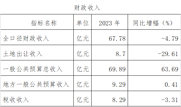 财政:2023年,全口径财政收入67.78亿元,比上年下降4.79%。土地出让收入8.7亿元,下降29.61%。一般公共预算总收入69.89亿元,增长63.69%。地方一般公共预算收入9.29亿元,增长0.41%;其中税收收入8.29亿元,下降3.31%。