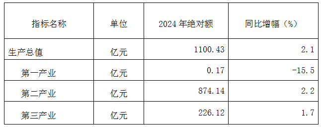 2024年汽开区地区生产总值(GDP)1100.43亿元,按可比价格计算,比上年增长2.1%。其中,第一产业增加值0.17亿元,下降15.5%;第二产业增加值874.14亿元,增长2.2%;第三产业增加值226.12亿元,增长1.7%。三次产业结构为0.1:79.4:20.5。