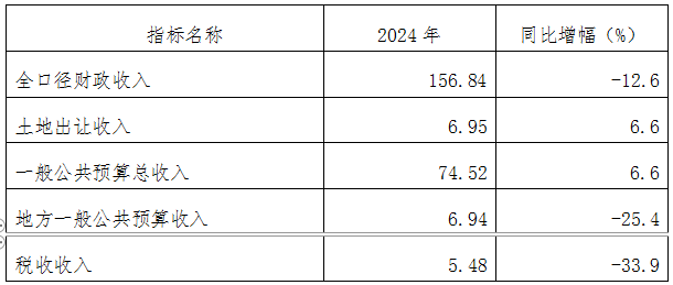 财政:2024年,全口径财政收入156.84亿元,比上年下降12.6%。土地出让收入6.95亿元,增长33.65%。一般公共预算总收入74.52亿元,增长6.62%。地方一般公共预算收入6.94亿元,下降25.35%;其中税收收入5.48亿元,下降33.89%、非税收入1.46亿元,增长45.34%。