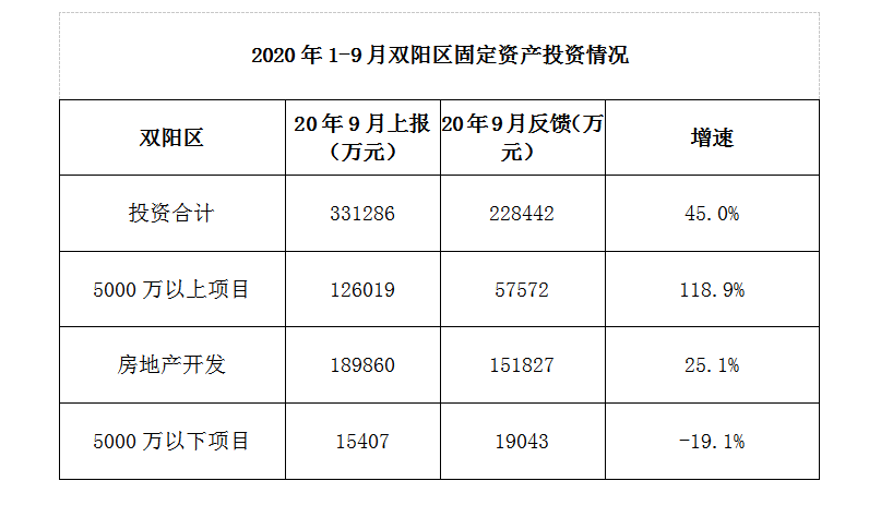 1-9月,双阳区固定资产投资增速呈快速增长趋势。全区共完成固定资产投资331286万元,同比增长45.0%。其中:5000万元以上项目完成投资126019万元,同比增长118.9%;5000万元以下项目完成投资15407万元,同比下降19.1%;房地产开发项目完成投资189860万元,同比增长25.1%。