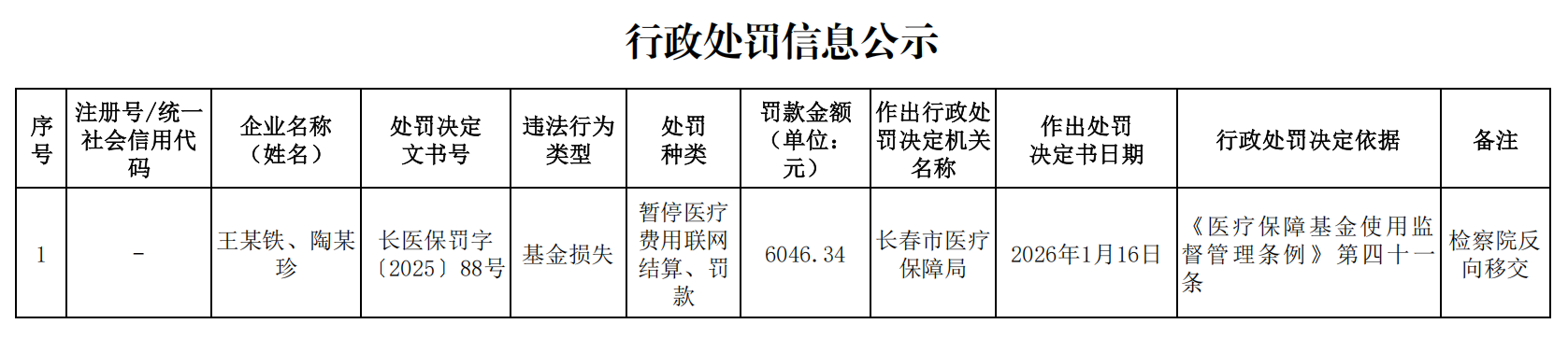 | 索引号: | 11220100MB1921645M/2026-00636 | 分 类: | 行政处罚结果公告 ; 公告 |